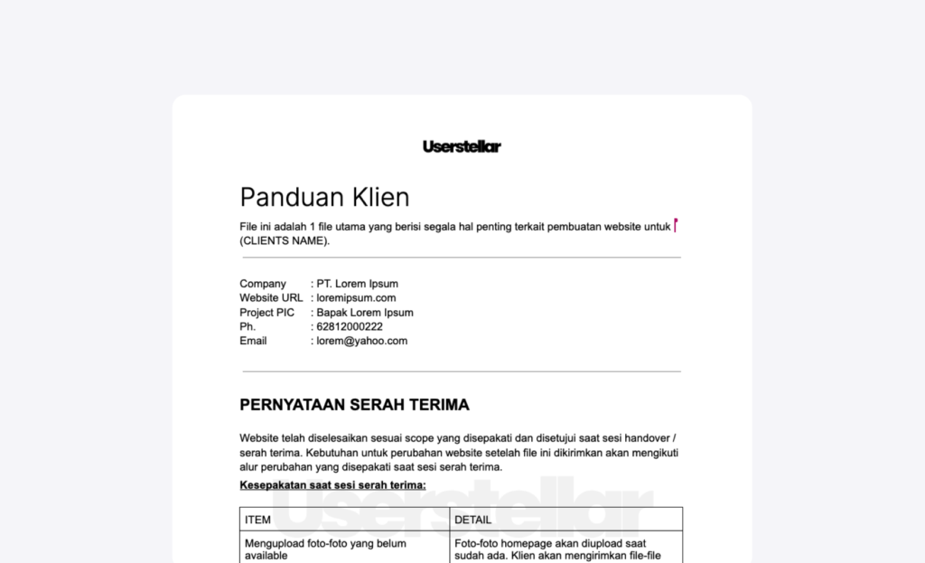 Ini adalah file dokumentasi yang saya pakai sendiri untuk melindungi waktu, struktur kerja, dan profesionalisme saya sebagai web designer; termasuk sebagai cara untuk membuat client experience yang lebih baik.